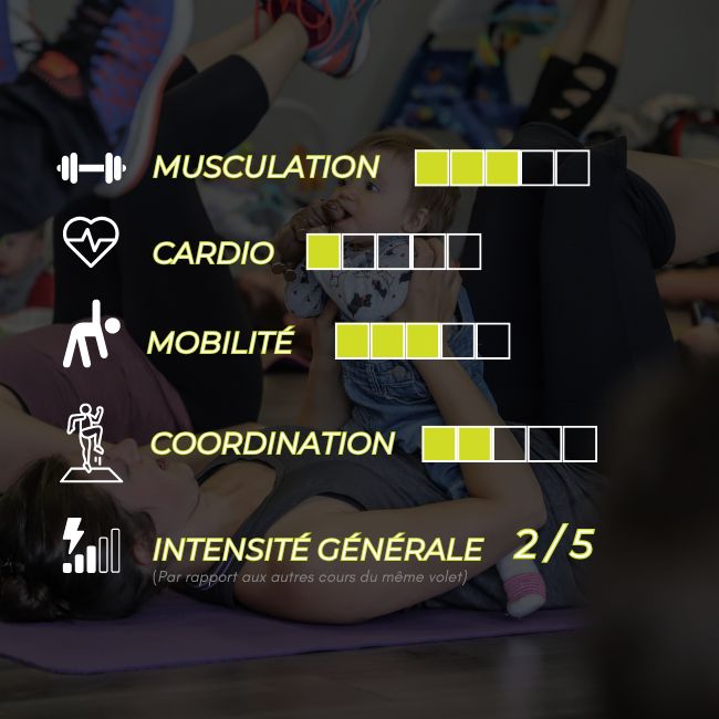 Lors de cet entraînement, les bébés sont bien installés tout près de vous dans une des nombreuses stations de jeu qui sont mises à votre disposition.